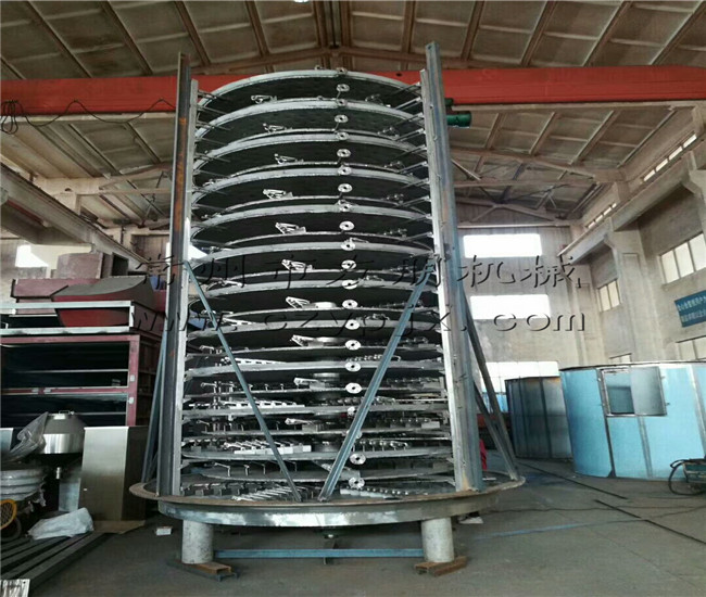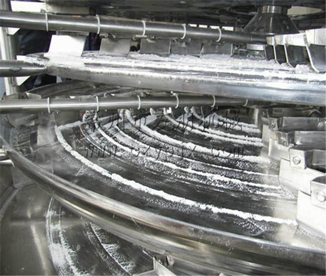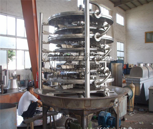 濕物料自加料器連續(xù)地加到干燥機頂部第一層干燥圓盤上,帶有耙葉的耙臂作回轉(zhuǎn)運動,耙葉連續(xù)翻抄物料。物料沿指數(shù)螺旋線流過干燥盤表面,在小干燥盤上的物料被移送到外緣,并在外緣落到下方的大干燥盤外緣,在大干盤上物料向里移動并從中間落料口落如下一層小干燥盤中。大小干燥盤上下交替排列,物料得以連續(xù)地流過整個干燥器。中空的干燥盤內(nèi)通入加熱介質(zhì),加熱介質(zhì)形式有飽和蒸汽、熱水和導(dǎo)熱油,加熱介質(zhì)由干燥盤的一端進入,從另一端導(dǎo)出。已干物料從^后一層干燥盤落到殼體的底層,^后被耙葉移送到出料口排出。濕份從物料中逸出,由設(shè)在頂蓋上的排濕口排出,真空型盤式干燥器的濕氣由設(shè)在頂蓋上的真空泵口排出。從底層排出的干物料可直接包裝。通過配加翅片加熱器、溶劑回收冷凝器、袋式除塵器、干料返混機構(gòu)、引風(fēng)機等輔機,可提高其干燥的生產(chǎn)能力,干燥膏糊狀和熱敏性物 料,可方便地回收溶劑,并能進行熱解和反應(yīng)操作。