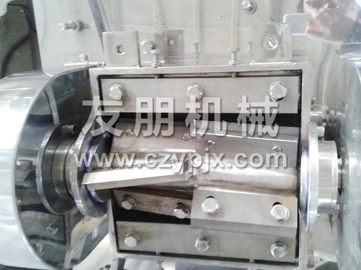 物料由進料斗送進粉碎室,經(jīng)刀刃和刀座的沖擊,旋轉(zhuǎn)刀和固定刀同時剪切粉碎,由于受到旋轉(zhuǎn)離心力的作用,物料自動從出口處流出。