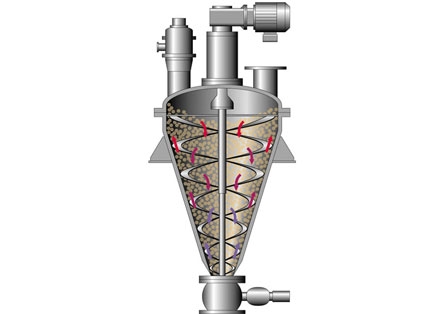 錐形螺帶混合機(jī)的攪拌裝置通常由中心螺旋軸和兩根與筒體內(nèi)壁表面吻合的外螺帶組合而成。旋轉(zhuǎn)時(shí),外螺帶由下向上沿筒體內(nèi)壁盤旋提升物料,由于螺帶帶面上各點(diǎn)線速度不同,物料在其作用下產(chǎn)生不規(guī)則的對(duì)流、剪切、摻混、擴(kuò)散,形成全方位復(fù)合運(yùn)動(dòng)。攪拌軸上的螺旋葉片,運(yùn)轉(zhuǎn)時(shí)又將中心物料提升、拋出,被拋出的物料一部分進(jìn)入螺帶,同時(shí),被螺帶拋出的部分物料又被吸收到螺旋葉片的螺旋包絡(luò)體內(nèi)被提升。如此反復(fù)循環(huán),使物料在短時(shí)間內(nèi)達(dá)到均勻混合。