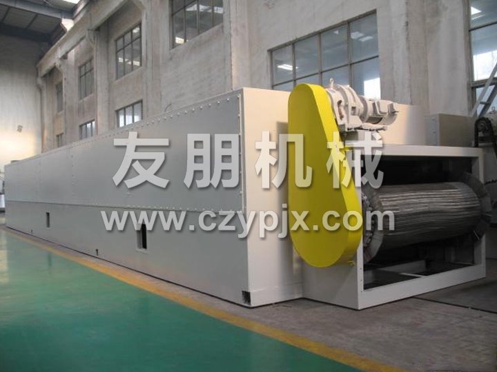 整個(gè)生產(chǎn)線(xiàn)為全封閉型(對(duì)物料而言),分別由擺動(dòng)布料段、干燥段、出料段三部分組成。擺動(dòng)布料段作用是使海藻均勻分散在網(wǎng)板上,并且勻速輸送到干燥段。海藻先后經(jīng)過(guò)80℃熱風(fēng)干燥段,90℃熱風(fēng)干燥段和120℃熱風(fēng)干燥段后,再經(jīng)過(guò)出料段排料。各單元內(nèi)的循環(huán)風(fēng)方向根據(jù)物料干燥階段不同和工藝要求需要,可采用向下式,向上式或兩者交替進(jìn)行。干燥加熱所需熱風(fēng)由引風(fēng)機(jī)吸入,并在風(fēng)機(jī)出風(fēng)口首先經(jīng)預(yù)分布器,再經(jīng)過(guò)孔板均風(fēng)后,熱風(fēng)從物料的下面向上(或從物料的上面向下)穿透物料層,對(duì)物料進(jìn)行加熱。